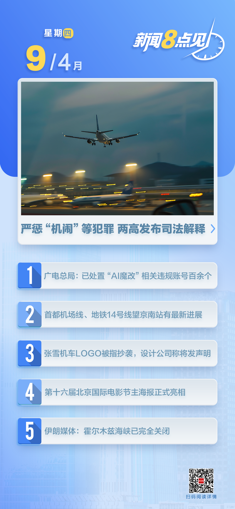 【时政】王毅将访问朝鲜。外交部发言人宣布:“应朝鲜外交部邀请,中共中央政治局委员、外交部长王毅先生将于4月9日至10日访问朝鲜。(外交部网)西班牙首相桑切斯将访华。”外交部发言人宣布:“应国务院总理李强邀请,西班牙首相桑切斯将于4月11日至15日对中国进行正式访问。(外交部网)中国国民党代表团成员郑立文率代表团参观孙中山陵。”4月8日上午,中国国民党主席郑立文率国民党代表团参观中山陵。中山陵 参观中山陵。一直是中国国民党主席访问大陆的重要组成部分。程来文此访是十年来中国民族主义领导人首次率团访问大陆。此行为期六天,代表团将访问江苏、上海、北京。 (新华社)阅读全文>>>二十届中央第七次巡视目标已揭晓。经党中央批准,二十届中央第七次检查包括中央社会工作部、中央政法委、最高人民法院、最高人民检察院、公安部、民政部、司法部、人力资源社会保障部、生态环境部、交通运输部、水利部、国家卫生部安全委员会和卫生部。退役军人事务部、应急管理部、国家通讯办公室、国家医疗保障局、中国科学院、中国工程院、国家移民管理局、中国民航局、国家邮政局、国家中医药管理局、国家疾病预防控制总局、国家矿山安全局、国家消防救援总局、国家食品药品监督管理局。医药管理局、中国地震局、中国气象局、国家自然科学基金委员会、中国老龄研究会、中国工程物理学会、中国科协、中国法学会、中国残联、中国红十字会、中国红十字会等36个部门党组织农科院进行了定期检查。 (新华社)国务院国有资产监督管理委员会设立境外外资司。记者从国务院国资委获悉,国务院国资委近日成立内外资司。 (新华社微博)国家广播电影电视总局:已删除100多个与“AI魔幻变身”相关的非法账号。为纠正“AI魔幻大变”视频扩散乱象,国家广电总局将从2026年1月起,对四大名著、历史题材、革命题材、英雄人物等经典电视剧《AI魔变》展开为期一个月的专项管理行动。我们重点铲除非法网络视频,同时也铲除一些邪教动漫。专项治理行动共删除违法视频2.3万多条,处理违法账号100多个,有效遏制了违法视频的传播。 (国家广播电视总局)阅读全文>>>对“空难”等犯罪行为从严处罚 4月8日,最高人民法院、最高人民检察院联合发布关于办理危害民航安全刑事案件适用法律若干问题的司法解释。说明依法惩治威胁民航安全刑事犯罪的现状和尚未解决的问题,以及相应的应对办法。确保各级司法机关依法适用法律更加准确有效严厉打击危害民航安全的刑事犯罪,建立了刑法适用的规定和刑事政策的准确把握。 (新华社)阅读全文>>> 乘客可携带符合高铁规定的狗、猫,全程进行隔离运输,人与宠物分开。从2026年4月8日开始,铁路部门将开始测试其高速宠物铁路运输服务,该服务在初期阶段已被证明是成功的。同日,该公司推出“宠物出行”服务,提供“携带宠物出行”和“仅携带宠物出行”两种交通方式。允许携带宠物的高铁车站和列车数量将增至121个和228个,更好地满足乘客的各种需求。 (中国铁路)阅读全文>>>13人死亡,3人联系不上!建岩黄河大桥塌方调查报告发布 2025年8月22日凌晨3时01分左右,中国铁桥局第七工程有限公司承建的新建西宁至成都铁路(以下简称西成铁路)简延黄河大桥建设工程发生大规模塌方,造成13人死亡、3人失踪,直接经济损失约4886万元。青海省政府常务会议近日审议通过了关于8月22日西城成都铁路尖寨黄河大桥建设工程倒塌调查报告。经调查发现,这是因建设部门在临时固定塔施工过程中违规采购和使用缺陷螺栓而引发的一起严重生产安全事故。上部配光束质量不符合要求,验收流于形式。加入张拉后分布梁损坏,斜拉固定系统损坏。柄部断裂,桥梁结构的一部分倒塌。由于建设、设计、监理、监测等部门没有切实履行安全义务,有关监管部门也没有充分履行职责,导致生产中发生重大安全事故。 (危机处理部)阅读全文>>> 【本地】首都机场线望京南站和地铁14号线最新进展。首都机场线望京南站项目位于景美路、广顺南街、万红西街交叉口以南的绿化带内。设计与14号线现有车站兼容。目前望京南站主体结构已完成15%,相关施工工作进展顺利计划。 (《北京公报》微信公众号)阅读全文>>>潭柘寺、玉台寺、妙峰山的38棵古树名木正在积极寻找养父母。 2026 年,一条专门用于门托古古树的收养路线将正式开放。丹泽寺、汤泰寺、妙峰山等地的38棵珍稀古树向公众开放,其中包括紫丁香、白松、油松等许多特色树种。树木有着悠久的历史和深厚的遗产。目前,处于审核阶段的股票有2只,其他股票还有36只。 (微信公众号‘北京门头沟’)阅读全文>>>【社会】河北省景县回应羊肉汤店“老鼠吃生肉”问题,发现情况属​​实,责令该店关门整顿。经查,网上报道的相关信息属实。根据《人民食品安全法》根据《中华民国》等相关法律法规,泾县市场监管局责令该店停业整顿,督促其迅速开展大规模消毒,必要时严格纠正安全隐患。同时,我们将对店内相关成分进行登记、封存,并送样分析。发现问题将依法处理。(泾县市场监管局官方微博)阅读全文>>>张雪摩托标识被指抄袭,设计公司已发布声明 4月8日,有网友在社交平台上指出,张雪摩托的标识涉嫌抄袭,与ZETA、中乐国际等公司的标识非常相