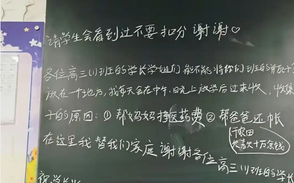 ▲安徽省淮南五中的中学生公开留言,要求长辈留下空瓶子。图/九拍新闻 近日,一张“高中生在黑板上留言收集废旧瓶子”的照片引起了网友的关注。据九杯新闻报道,安徽淮南五中一名高中生想挣钱给母亲治病,帮父亲还清债务,于是公开在学校黑板上留言,要求长辈留下空瓶子,收集废弃瓶子,帮助解决家庭问题。现在每个学校班级都有一个容器、盒子或桶来存放学生的废瓶,方便集中收集。放学后,学生们去每个班级收集瓶子或萨达。对于高中生来说,在校园里公开谈论家人面临的困难并尝试在校园里分享家庭的担忧并不容易。他们自己的方式。大多数青少年都很敏感并且有很强的自尊心。 Having a “pretty face” is common and a fact.然而,这个年轻人却摆脱了束缚,直面挑战。他的谦逊、傲慢和坦率使他超越了许多同龄人。这种诚实比一个空瓶子更重要。年轻人的坦诚背后是坚韧和责任感,这种面对逆境的勇气既令人心碎又令人敬佩。可悲的是,在他无忧无虑、专注学习的年纪,却要分担家庭的重担。好消息是,这个年轻人不为困难所困扰;从学生时代起,他就养成了一种责任感。这个过程所需要的承诺是无价的。学校没有严厉批评男孩的行为,也没有组织大笔捐款。相反,通过安装特殊的容器,孩子的尊严得到了精心保护。ner。这所学校的努力,成功地向更多学生具体地传达了“对他人的宽容和善意”,同时也在一定程度上维护了他们的尊严。如果有人遇到麻烦,学校将尽一切努力尊重学生。另一方面,选择以潜移默化的方式成功引导更多的学生。这种教育理念显然是最温和的教育基础。这对其他同学来说也是一堂高质量的道德课。毕竟,只有让学生学会包容他人的困境并尊重他人的尊严,他们才能在特定的实践中成为更好的人。因此,人们虽然对年轻人的行为感到满意,但也希望年轻人的情况能够引起相关部门的重视。如果情况符合相应的融资条件,必要的支持机制可以及时投入运行,让学生摆脱困境。尽快,安心学习。总的来说,空瓶子引发的关注和争论不仅体现了年轻人的责任感,也展现了学校的教育智慧和温暖。让我们祝贺这位年轻人,希望他能早日走出困境,以更饱满的姿态继续前行,拥抱更广阔的人生。撰稿/编辑:苏希怡(媒体人员)/校对:何锐/李丽君