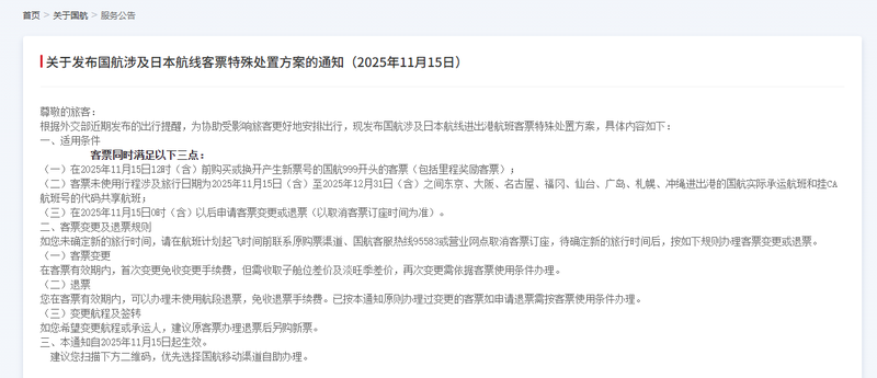 新京报11月14日晚,外交部领事司要求中国公民近期避免前往日本旅行。 11月15日,国航、东航、南航发布关于日本航线机票特殊处理的通知。出行日期在12月31日之前的客票,符合条件的,可免费退票或改签。全文如下: 国航宣布推出包括日本航线在内的机票特别折扣计划。据外交部近日发布的出行提醒,为帮助受影响旅客更好地安排出行,国航公布了包括日本航线在内的往返机票特别供应计划。具体细则如下: 一、伯乐适用条件同时满足以下三个条件: (1)购买或变更国航航班始发的客票2025年11月15日中午(含)前更换新客票号的999(含里程奖励客票) (2)客票未使用的行程必须为2025年11月15日(含)至2025年12月31日之间的旅行日期。2025年(含东京、大阪、名古屋、福冈、仙台、广岛)往返国航实际承运的航班札幌/冲绳及CA航班号代码共享航班(3)2025年11月15日午夜后申请改签/退票(以机票预订取消时间为准) 2.机票变更/退票规则 如果您没有新的行程行程,请联系您原购票渠道国航。航班计划起飞时间一经确定,可进行变更或变更。请联系我们的热线95583或我们的售票处取票,我们将按以下规则处理: (一)客票变更 客票有效期内首次变更不收取任何费用,但次日变更不收取任何费用。后续变更将根据机票的条款和条件进行处理。退款 您可以在客票有效期内就未使用的航段申请退款,并免收退款费用。如果您对按照本须知原则修改过的客票要求退票,您必须按照客票的条款要求办理退款。如果您更改航线或航空公司,我们建议您退还原机票,然后购买新机票。东航对日本相关航线客票实行特殊处理,已发布通知。近日,外交部和东航驻日本使领馆公布了东航含日本航线客票的特别处理方案,以便更好地组织行程含日本航线的旅客出行。 1、适用范围如下。 (一)门票发行东航781客票至少有1个未使用航段,其中包括日本(包括东京、大阪、广岛、札幌、鹿儿岛、长崎、新泻、冈山、福冈、静冈、名古屋、松山、冲绳、富山、熊本)。出发日期在2025年11月15日至2025年12月31日之间的航班或中转航班(包括东航、上航或其他航空公司的航班)。2025年以及同一客票内其他未使用的航段日期均无效。 (2) 出票或补发日期:中午 12:00 之前2025年11月15日(三)行程取消日期本规定适用于2025年11月15日(含)至原定出发时间期间取消行程的旅客。此规则不适用于在航班预定起飞时间之后或 2025 年 11 月 14 日(含)之前取消行程的乘客。 2. 退换货政策以上述范围为准。弗吉尼亚州期间客票有效期、退票、变更可按下列规定办理。 (1)原定航班前后3天内变更航班免费。在原定航班之前或之后三 (3) 天以上进行的额外变更或航班变更必须根据机票条款和条件进行处理。 (2)退票 在客票有效期内,未使用的航段可在原购票柜台办理退票,不收取退票费用。如果您对按照上述原则进行修改的客票人要求退票,则需要按照客票的条款要求办理退款。 (3)航线变更及审批如果您变更航线或航空公司,我们建议您退还原机票,然后重新购买机票。 (4)不符合上述适用范围的客票,按照始发地使用条件办理退票或修改票。东航温馨提示您: 1、如果您已提前完成乘机、选座等服务,建议您返回原处理通道取消乘机、选座并办理改签或退票。 2. 如果您尚未确定行程,请务必在出发前取消。若客服热线繁忙,建议您选择原购票渠道东航APP/小程序(萨特服务-票务服务-行程取消)取消行程。南航发布关于日本航线客票特殊处理的通知。根据外交部近期发布的出行通知,为更好地组织旅客出行计划,现就南航赴日航线机票特殊处理公告如下。 1. 对于购买或电子门票变更为2025年11月15日12:00前购买的符合条件的客票(含南航784航班),未使用的行程包括2025年11月15日至11月15日(含)和2025年12月31日(含)期间南航实际承运的往返日本(含中转目的地)的航班,或南航航班号的代码共享航班。 2. 变更/退票政策 旅客在飞机起飞前取消已定妥座位的,可在客票有效期内按以下规定办理退票/变更手续。 (1)客票首次变更为南航同航线实际承运航班的,不收取变更费。若费率有差异,我们将按规定收取差价。任何后续变更均需根据机票的条款和条件进行。 (2) 退款 如果您在有效期内要求退款在您的机票有效期内,将免除退票费用。如果您对按照上述原则进行修改的客票要求退票,则需要按照客票的条款要求办理退款。 3. 其他一切事宜均以机票条款为准。编辑刘嘉妮